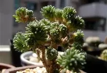 小松绿是景天科景天属植物,多肉植物,植株低矮,多分枝,株型近似球状,新枝浅绿色,以后逐渐转为灰白色,肉质叶近似针状。枝条下部的老叶容易干枯,贴在枝干上,形成类似松树皮般的龟裂,数月才脱落,…全部>>