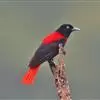 朱鹂:中等鸟类,体长23-28厘米。雄鸟绛紫红色,头、上胸及翼黑色。雌鸟上背及背部深灰色,尾覆羽及尾绛紫红色,腹部及下胸白而密布黑色纵纹。与鹊色鹂幼鸟的区别在上背灰色较深,下体白色较少且纵纹较粗。…全部>>