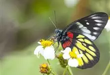 报喜斑粉蝶是粉蝶科斑粉蝶属的一种动物,又名红肩粉蝶、藤粉蝶等。幼虫群集性很强,从同一卵块孵化出的幼虫,幼龄期全部群集在一起取食,高龄幼虫常分散成小群。幼虫群集危害叶片,造成秃枝,严重者可将树吃成光杆,…全部>>