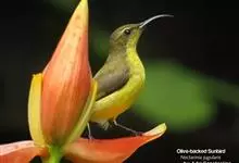 纹背捕蛛鸟:为太阳鸟科捕蛛鸟属的鸟类。是太阳鸟科中体型较大的一种,体重25-45克,体长160-210毫米。嘴粗长而尖且向下弯曲。上体橄榄黄色具黑色中央斑纹。下体淡黄白色满布黑色纵纹,尾具黑色次端斑。…全部>>