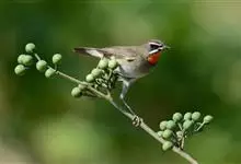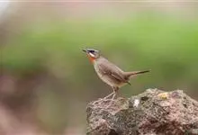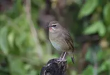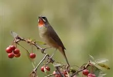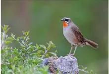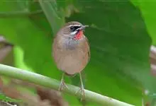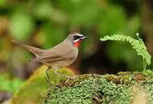 红点颏:是鸟纲、鹟科的鸣禽。又名西伯利亚歌鸲。体长14-17厘米,体重16-27克。雄鸟头部、上体主要为橄榄褐色。眉纹白色。颏部、喉部红色,周围有黑色狭纹。胸部灰色,腹部白色。雌鸟颏部、喉部不呈赤红色,…全部>>