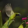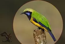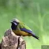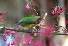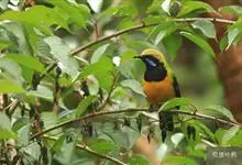 橙腹叶鹎体形大小和金额叶鹎相似,体长16~20厘米。额至后颈黄绿色,其余上体绿色,小覆羽亮钴蓝色,形成明显的肩斑。颏、喉、上胸黑色具钴蓝色髭纹,其余下体橙色。飞羽和尾羽雄鸟黑色、雌鸟绿色。…全部>>