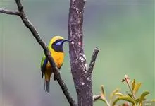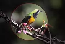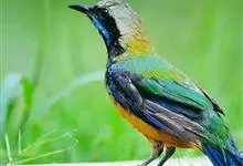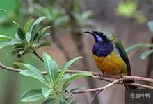 橙腹叶鹎体形大小和金额叶鹎相似,体长16~20厘米。额至后颈黄绿色,其余上体绿色,小覆羽亮钴蓝色,形成明显的肩斑。颏、喉、上胸黑色具钴蓝色髭纹,其余下体橙色。飞羽和尾羽雄鸟黑色、雌鸟绿色。…全部>>