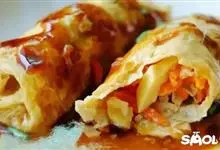 腐皮卷素菜是一道广东省的传统名菜,属于粤菜系。把香菇用清水浸软,去蒂,切细丝,胡萝卜,榨菜分别洗净,切细丝,豆芽,韭黄分别洗净,韭黄切段。用2汤匙油爆香姜丝,胡萝卜,榨菜,放入香菇同炒透,将豆芽放入…全部>>