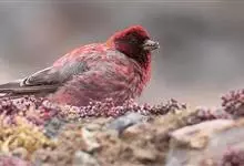 藏朱雀:全长约17-18厘米。雄鸟头部深红色具光辉,喉部暗红色具白色点斑;背部灰白色,各羽具玫瑰红色羽端,形成许多斑纹;腰部淡玫瑰红色;翅暗褐色,沾灰白,羽端沾玫瑰红或灰白色;尾暗棕色,端缘玫瑰红色…全部>>