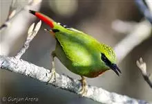 火尾绿鹛是莺科、绿鹛属小型鸟类,体长11-14厘米。上体绿色,头顶至枕具黑色鳞状斑,眼先和眼后黑色,眉纹黄绿色。两翅黑色具黄色和红色翅斑及白色端斑,极为醒目。中央一对尾羽绿色,外侧尾羽鲜红色。…全部>>