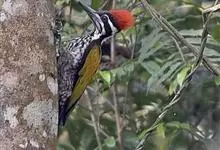 三趾啄木鸟,是啄木鸟科、啄木鸟属的小型鸟类,体长20-23厘米,雄鸟头顶金黄色,雌鸟黑色而具白色斑点。眼至耳覆羽黑色,眼后有一条白色纵纹,颊纹白色,颚纹黑色,甚为醒目。枕和后颈黑色,…全部>>