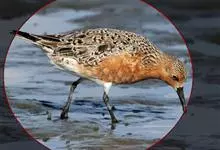 红腹滨鹬,是鹬科、滨鹬属的小型涉禽,体长23-25厘米,嘴较短而直、黑色,脚亦甚短、绿色。体较粗胖。夏季上体灰褐色具黑色中央纹,背具棕栗色和白色斑纹和羽缘,头侧和整个下体栗红色。冬季棕红色消失,…全部>>