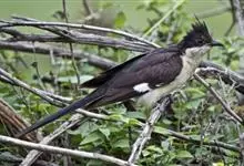 斑翅凤头鹃: 成鸟具羽冠,上体及头侧、翅、尾等黑色,具铁绿色亮辉,尾羽端部具白斑,两侧者形宽,中央者较狭;下体白色、淡灰白或略带棕黄色。虹膜褐至红褐色;嘴黑色;脚灰蓝黑色。…全部>>