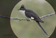 斑翅凤头鹃: 成鸟具羽冠,上体及头侧、翅、尾等黑色,具铁绿色亮辉,尾羽端部具白斑,两侧者形宽,中央者较狭;下体白色、淡灰白或略带棕黄色。虹膜褐至红褐色;嘴黑色;脚灰蓝黑色。…全部>>