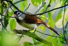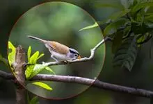 点胸鸦雀是莺科、鸦雀属小型鸟类,体长18-21厘米。头顶至枕橙棕色,嘴橙黄色、短而粗厚,脸皮黄色,耳覆羽和颊后部黑色,眼圈白色。上体棕褐色。颏黑色,其余下体淡皮黄白色,喉和上胸具黑色矢状斑。…全部>>