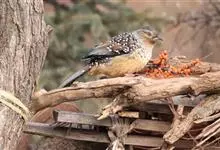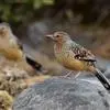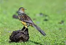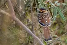 大噪鹛:中型鸟类,体长32-36厘米。额至头顶黑褐色,背栗褐色满杂以白色斑点,斑点前缘或四周还围有黑色。初级覆羽、大覆羽和初级飞羽具白色端斑。尾特长,均具黑色亚端斑和白色端斑。颏、喉棕褐色,…全部>>