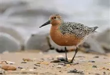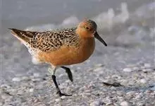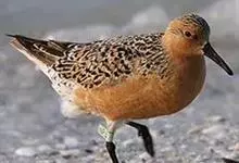 红腹滨鹬,是鹬科、滨鹬属的小型涉禽,体长23-25厘米,嘴较短而直、黑色,脚亦甚短、绿色。体较粗胖。夏季上体灰褐色具黑色中央纹,背具棕栗色和白色斑纹和羽缘,头侧和整个下体栗红色。冬季棕红色消失,…全部>>