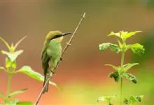 绿喉蜂虎是佛法僧目、蜂虎科的小型鸟类,共有9个亚种。身长22-25厘米,翼展29-30厘米,体重15-20克。喉绿色,额部、头顶至上背为锈红色,其余上体均为亮绿色。中央尾羽延长且端段狭细,…全部>>