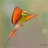 栗喉蜂虎是蜂虎科蜂虎属的鸟类。有热带鸟类羽毛艳丽的特征:喉部是栗红色的,黑色的过眼纹,翅膀和背部是绿色的,尾翼是蓝色的,飞行时翅膀下面的羽毛是橙黄色的,在阳光的照射下,它们全身闪烁着金属般的艳丽光泽,…全部>>