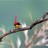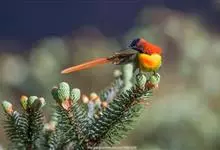 火尾太阳鸟为太阳鸟科太阳鸟属的鸟类。体长20厘米,色彩艳丽。雄鸟红色,具形长的艳猩红色中央尾羽。头顶金属蓝色,眼先和头侧黑色,喉及髭纹金属紫色。下体黄色,胸具艳丽的橘黄色块斑。雌鸟灰橄榄色,腰黄,…全部>>