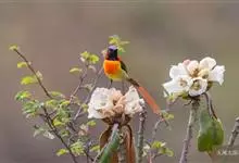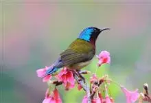 黑胸太阳鸟:小型鸟类,体长9-15厘米。嘴细长而向下曲。雄鸟中央尾羽特长,尾呈楔形,头顶至后颈紫蓝色具金属光泽;背褐红色,腰有一黄色横带,尾上覆羽和尾紫蓝色;颏、喉和上胸乌黑色,有的下胸为硫黄色,…全部>>