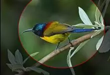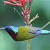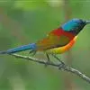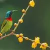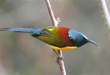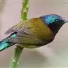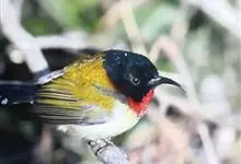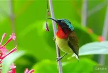 绿喉太阳鸟:共有9个亚种。小型鸟类,雄鸟体长13-15厘米、雌鸟10-12厘米。雄鸟前额至后颈、颏和喉辉绿色,头侧黑色,颈侧和背暗红色,两肩、下背橄榄绿色,腰鲜黄色,尾上覆羽和中央尾羽暗绿色,…全部>>