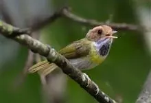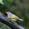 棕脸鹟莺:体长10厘米,是一种色彩亮丽而有特色的莺鸟。头栗色,具黑色侧冠纹。上体绿,腰黄色。下体白,颏及喉杂黑色点斑,上胸沾黄。与栗头鹟莺的区别在头侧栗色,白色眼圈不显著且无翼斑。…全部>>