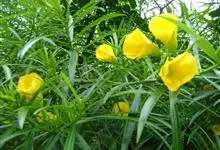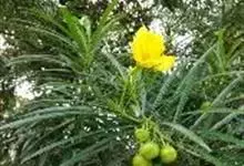 黄花夹竹桃K. Schum.),又名“酒杯花”“柳木子”“黄花状元竹”,是夹竹桃科,黄花夹竹桃属下的常绿乔木植物。高达5m,全株无毛,树皮棕褐色;叶互生,近革质,线形或线状披针形;花大,黄色,具香味,…全部>>