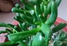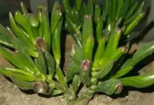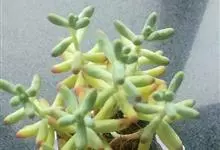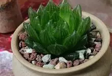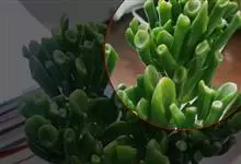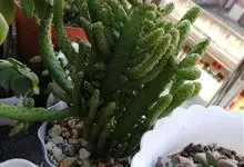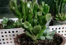 筒叶花月,是景天科青锁龙属的多年生草本植物。植株多分株,灌木状,茎较粗壮,圆柱形,表皮灰褐色;叶片肉质,互生,呈圆筒状,簇生于茎或分枝顶端,叶端呈斜截形,截面为椭圆形;花呈星状,淡白色;花期秋季。…全部>>