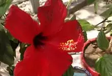 朱槿,锦葵科木槿属的常绿灌木,叶子呈阔卵形或狭卵形,边缘具粗齿;花生于上部叶腋间,常下垂,花冠呈漏斗形且为玫瑰红色或淡红、淡黄等色,花瓣呈倒卵形,先端圆;蒴果为卵形,平滑无毛且有喙;花期全年。它的名称,…全部>>
