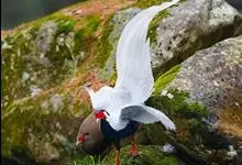 白鹇,是鸡形目雉科鹇属的一种留鸟。雄鸟上体白色并具黑色纹,下体黑色,头顶具黑色长羽冠,尾白而长;雌鸟体型较小,以橄榄褐色为主,下体具白色或皮黄色细纹;虹膜褐色,眼周具红色裸皮,喙黄色,脚鲜红色。…全部>>