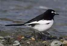 日本鹡鸰:体长约20厘米。上体多黑色,额、颏及眉纹白,下体白,两翼黑而具白色横斑及羽缘,尾黑而边缘白色。虹膜深褐色;嘴黑色;脚黑色。飞行时发出嘁喳声,具复杂而独特的鸣声。喜农田、稻田和溪流。…全部>>