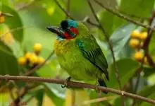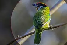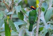 金喉拟啄木鸟,是须鴷科、拟啄木鸟属的鸟类。金喉拟啄木鸟为小型鸟类,体长19-24厘米。额深红色,头顶金黄色,后枕具一大块深红色斑,耳羽和头侧银灰色,上体草绿色,颏和上喉金黄色,下喉淡银灰色,…全部>>