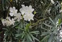 白花夹竹桃是夹竹桃科、夹竹桃属植物夹竹桃的栽培品种。常绿直立大灌木,枝条灰绿色;嫩枝条具稜,被微毛,老时毛脱落。叶3-4枚轮生,下枝为对生,叶面深绿,叶背浅绿色;侧脉纤细平行与中脉成直角;叶柄扁平,…全部>>