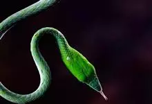 绿瘦蛇是游蛇科,瘦蛇属轻毒性后沟牙毒蛇。体型极细而长,长可达1.5米。头较窄长,与颈区分极明显;吻端略圆而平扁,超出下领;眼大,瞳孔呈一横缝;颊区呈一凹槽;躯干瘦长侧扁,尾甚长而细。背面鲜绿色,…全部>>