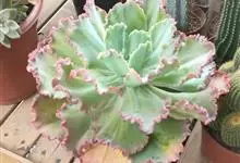 女王花笠,又名扇贝石莲花、女王花舞笠,是景天科拟石莲花属的多肉植物。由美国加利福尼亚州的育种师Dick Wright于1964年培育。特征是呈大波浪状褶皱的红色叶缘和气质高贵的粉紫色调。…全部>>