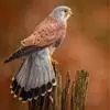 红隼:是隼科、隼属的小型猛禽之一。体重173-335克,体长305-360毫米。翅狭长而尖,尾亦较长,外形和共同爪隼非常相似。雄鸟头蓝灰色,背和翅上覆羽砖红色,具三角形黑斑;腰、尾上覆羽和尾羽蓝灰色,…全部>>