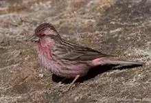 喜马拉雅白眉朱雀:小型鸟类,体长15-17厘米,体重24-35克。额基、眼先深红色,前额和一条长而宽阔的眉纹珠白色沾有粉红色并具丝娟光泽,在暗色的头部极为醒目。头顶至背棕褐或红褐色、具黑褐色羽干纹,…全部>>