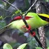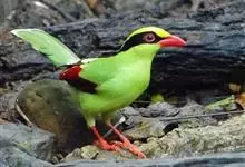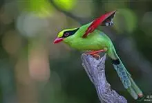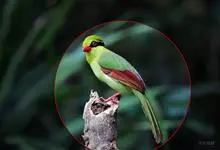 蓝绿鹊:中型鸟类,共有5个亚种。体长36-38厘米。尾长,嘴、脚红色。通体羽色主要为草绿色,宽阔的黑色贯眼纹向后延伸到后颈,在绿色的头侧极为醒目。两翅栗红色,内侧飞羽具黑色次端斑和白色尖端。尾绿色,…全部>>