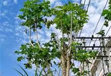 番木瓜,番木瓜科番木瓜属的常绿软木质小乔木,高达10米,具有乳汁;茎不分枝或有时于损伤处分枝;叶大且聚生于茎顶,近似盾形,叶柄中空;花单性或两性,有些品种雄株偶尔生两性花或雌花,…全部>>