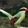 蓝绿鹊:中型鸟类,共有5个亚种。体长36-38厘米。尾长,嘴、脚红色。通体羽色主要为草绿色,宽阔的黑色贯眼纹向后延伸到后颈,在绿色的头侧极为醒目。两翅栗红色,内侧飞羽具黑色次端斑和白色尖端。尾绿色,…全部>>