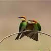 栗喉蜂虎是蜂虎科蜂虎属的鸟类。有热带鸟类羽毛艳丽的特征:喉部是栗红色的,黑色的过眼纹,翅膀和背部是绿色的,尾翼是蓝色的,飞行时翅膀下面的羽毛是橙黄色的,在阳光的照射下,它们全身闪烁着金属般的艳丽光泽,…全部>>