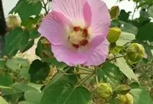 木芙蓉,锦葵科木槿属落叶灌木或小乔木。小枝上有细绒毛;叶片为卵状心形,托叶为披针形,常早落;花单生,花萼为钟形,花冠初为白色或淡红色,后逐渐变为深红色;果实为扁球形,有淡黄色的毛附着。花期8到10月。…全部>>