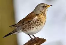 田鸫是鸫科、鸫属中型鸟类,体长25-28厘米,个体较一般鸫大。头顶、颈、腰淡蓝灰色,额和头顶有少许黑色纵纹,背栗褐色,两翅和尾黑褐色,眉纹白色。下体白色,喉、胸缀锈黄色具黑褐色纵纹,…全部>>