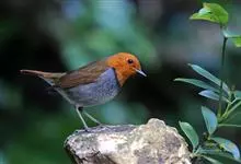 日本歌鸲:体型小似麻雀,但羽毛颜色较为美丽。嘴细长,嘴须不发达;翅短圆,上体草黄褐;雄鸟喉部橙棕色,十分明显,雌鸟却转为淡橙黄色。第一枚初级飞羽短狭;尾长约为跗蹠长度的二倍;跗蹠黑褐色,形粗长而健。…全部>>