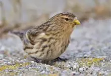 黄嘴朱顶雀:为燕雀科金翅雀属的鸟类。体重10-18克,体长112-162毫米。是一种体型小的褐色具纵纹的雀鸟。腰粉红或近白。与其他朱顶雀的区别在头顶无红色点斑,体羽色深而多褐色,尾较长,叫声也不同。…全部>>
