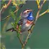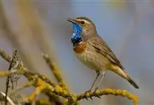 蓝点颏亦称“蓝喉歌鸲”,通称蓝靛颏儿。身体大小和麻雀相似,体长12-13厘米,体重17-18克。头部、上体主要为土褐色。眉纹白色。尾羽黑褐色,基部栗红色。颏部、喉部辉蓝色,下面有黑色横纹。下体白色。…全部>>