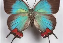 天堂凤蝶翅展可达105mm。前、后翅自基角至后缘约1/2~2/3端为纯净的宝蓝色,后角至后缘1/3~1/2端为黑色,后翅有黑色的尾突。翅背面为棕褐色。全部>>