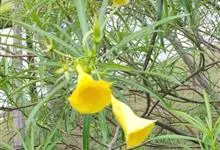 黄花夹竹桃K. Schum.),又名“酒杯花”“柳木子”“黄花状元竹”,是夹竹桃科,黄花夹竹桃属下的常绿乔木植物。高达5m,全株无毛,树皮棕褐色;叶互生,近革质,线形或线状披针形;花大,黄色,具香味,…全部>>