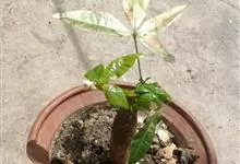 瓜栗 Walp. ),俗称发财树,木棉科小乔木,高4-5米,树冠较松散,幼枝栗褐色,无毛。小叶具短柄或近无柄。花单生枝顶叶腋;花梗粗壮,被黄色星状茸毛,脱落;萼杯状,近革质;花瓣淡黄绿色,狭披针形…全部>>