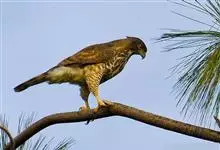褐耳鹰的体形比苍鹰要小得多,为小型猛禽,体长为31-44厘米,体重217-325克。上体灰色,下体具赤褐色横斑。第6枚初级飞羽外羽片无缺刻,次外侧的4对尾羽具5道黑褐色横斑。眼先具白色短羽。…全部>>