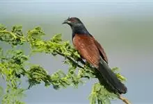 褐翅鸦鹃,是鹃形目鸦鹃科鸦鹃属的鸟类。褐翅鸦鹃的身体为黑色;头颈和胸带蓝紫色金属光泽并具黑亮的羽干纹,下胸至腹部泛金属绿光泽;两翼和肩部为棕栗色,外侧飞羽具暗色羽端,尾羽闪铜绿色光泽;虹膜赤红色,…全部>>