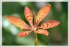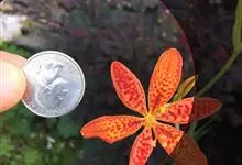 射干 Redouté)是鸢尾科射干属多年生草本植物。根状茎为不规则的块状,斜黄色或黄褐色;花橙红色,散生紫褐色的斑点;花药呈条形;子房下位,倒卵形;蒴果倒卵形或长椭圆形;种子圆球形,黑紫色,有光泽。…全部>>