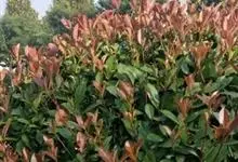 红叶石楠 是蔷薇科,石楠属杂交种,为常绿小乔木或灌木,乔木高可达5米、灌木高可达2米。叶片革质,长圆形至倒卵状、披针形,叶端渐尖,叶基楔形,叶缘有带腺的锯齿,花多而密,复伞房花序,花白色,梨果黄红色,…全部>>